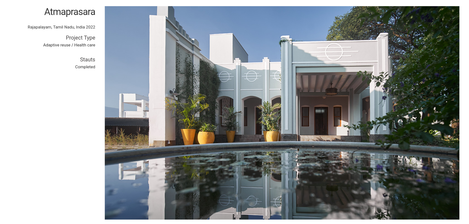Atmaprasara is a mental wellness facility located in Rajapalayam, Tamil Nadu, that was once an old ginning factory with three distinct buildings a factory structure, an office building and a residence dating back to the 1960s and 1980s, respectively tively. campus was designed to provide free mental health services through counseling, workshops, and educational initiatives.